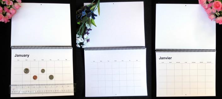 The perpetual calendar in this size, that is without dates pre-printed, comes in three different styles pictured below. The middle style has just the days of the week and the grid (no months). The others (English on left, French on the right) have months and days of the week pre-printed. |