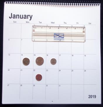 Calendar shown with rulers and coins to show relative size of the grid and boxes. |