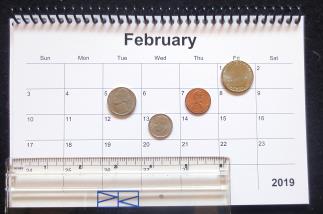 Representative small calendar with coins and rulers to show relative size of spaces on the grid |