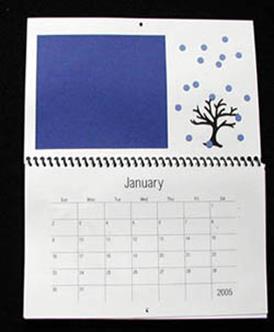 · Printed one month per page, single-sided · Each page is a half sheet of bright white heavyweight cardstock, measuring 8.5” wide by 5.5” high. · The front cover is blank on both sides . · Each page easily accommodates a 4x6 or a 5x7 photo along with mat or accents. See samples of decorated calendars to see a few illustrations of what might work. · The area on the back of the previous month's page above it is blank and undecorated, ready for your creativity. · The calendar pages come with a hole so that it can be hung on a wall. · When opened flat, the decorated top and printed calendar bottom measure approximately 8.5x11". |
